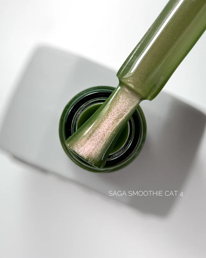 Saga Smoothie Cat Cat Eye Gel è una collezione duochrome. La tonalità può variare a seconda della posizione delle particelle metalliche all’interno della texture. La dimensione del riflesso influisce sulla tonalità dominante. Pigmenti profondi e iridescenti creano una brillantezza complessa e sfaccettata sulle unghie. Questo rende la manicure vivace, espressiva e unica a ogni movimento della mano.